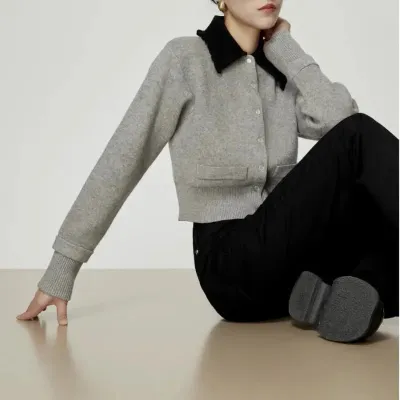 Autumn New Style Colorblocked Lapel Short Knit Cardigan Jacket For Women