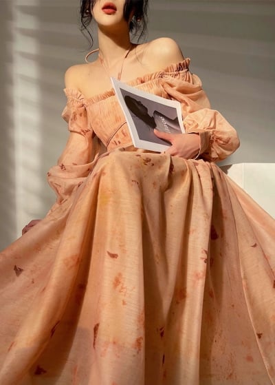 Graduation Gift Back to School Season Summer Dress Spring Outfit DIY Orange Slash neck Wrinkled Exra Large Hem Print Silk Cinch Dresses Long Sleeve