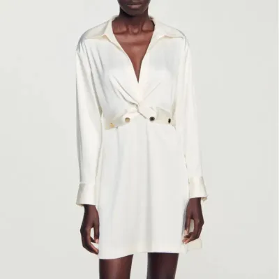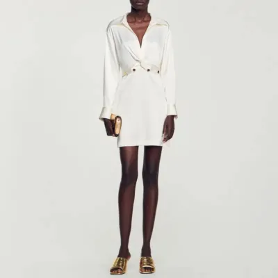 Women's Clothing Design Style Gold Button Waisted Silk Shiny White Dress Dresses for Prom