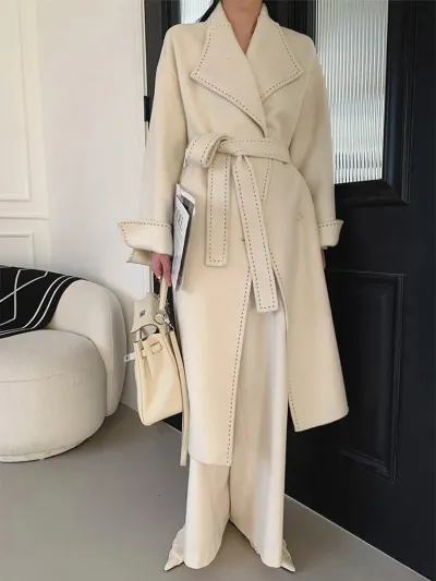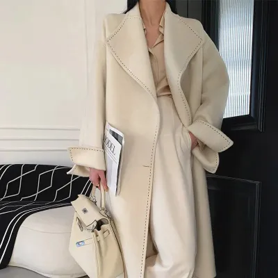 New Women Simple Arch Needle Doulbe-sided Wool Coat Loose Long Lapel Lace-up Fashion Woolen Jacket Warm Outerwear Autumn Winter