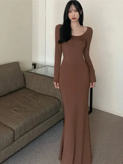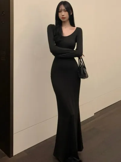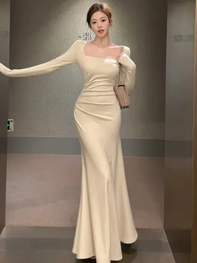 Korean Women Casual Mermaid Dress 2023 Fashion New Solid Ladies Long Sleeve Party Clothes Autumn Slim Waist Sexy Maxi Dresses