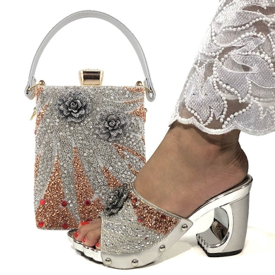New Arrival Fashionable Italian Shoes and Bag Sets Silver Color Women's Shoes with Appliques for African lady Sandals