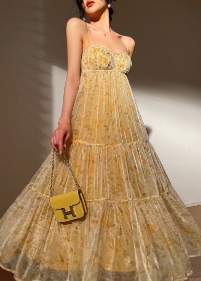 Graduation Gift Back to School Season Summer Dress Spring Outfit Modern Yellow Print Bustier Patchwork Exra Large Hem Silk Spaghetti Strap Dresses Sleeveless