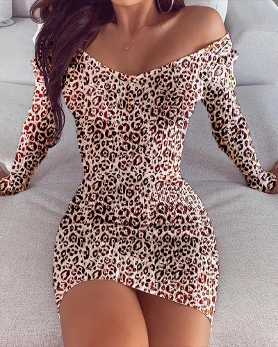 4 Colors Leopard Printing Mini Dress Sexy Lady V-Neck Long Sleeve Dresses Women Club Party Leopard Dress Large Size 5Xl