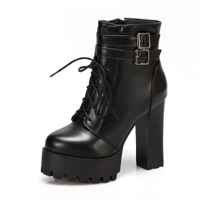 New Fashion PU Lacing High Heel Boots Women Thick With Belt Buckle Ankle Boots Square Heels Bare Foot Shoes White