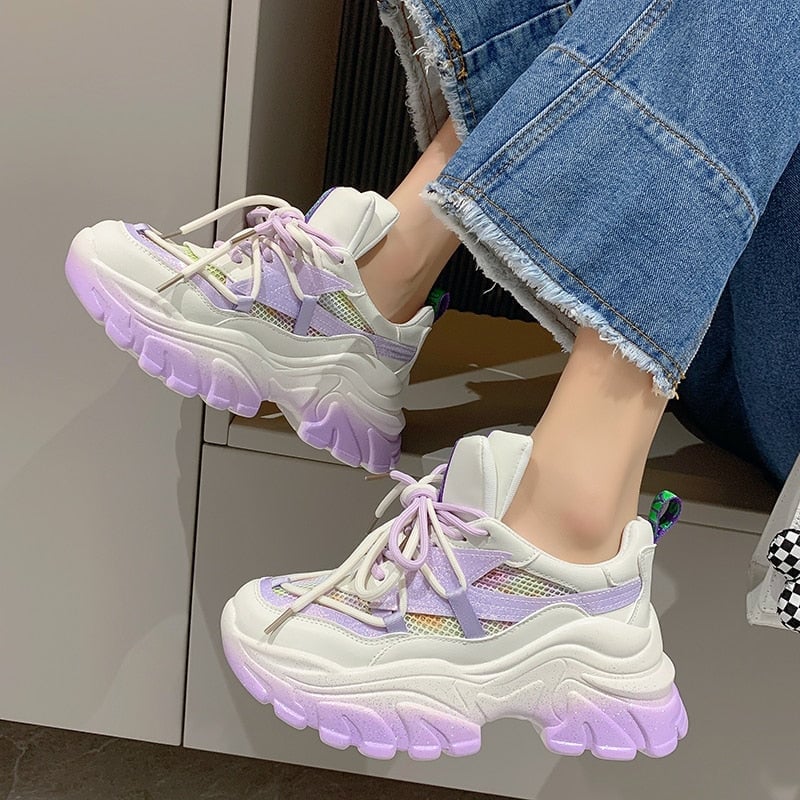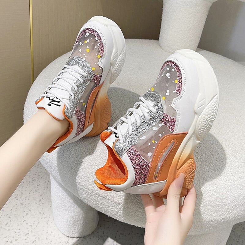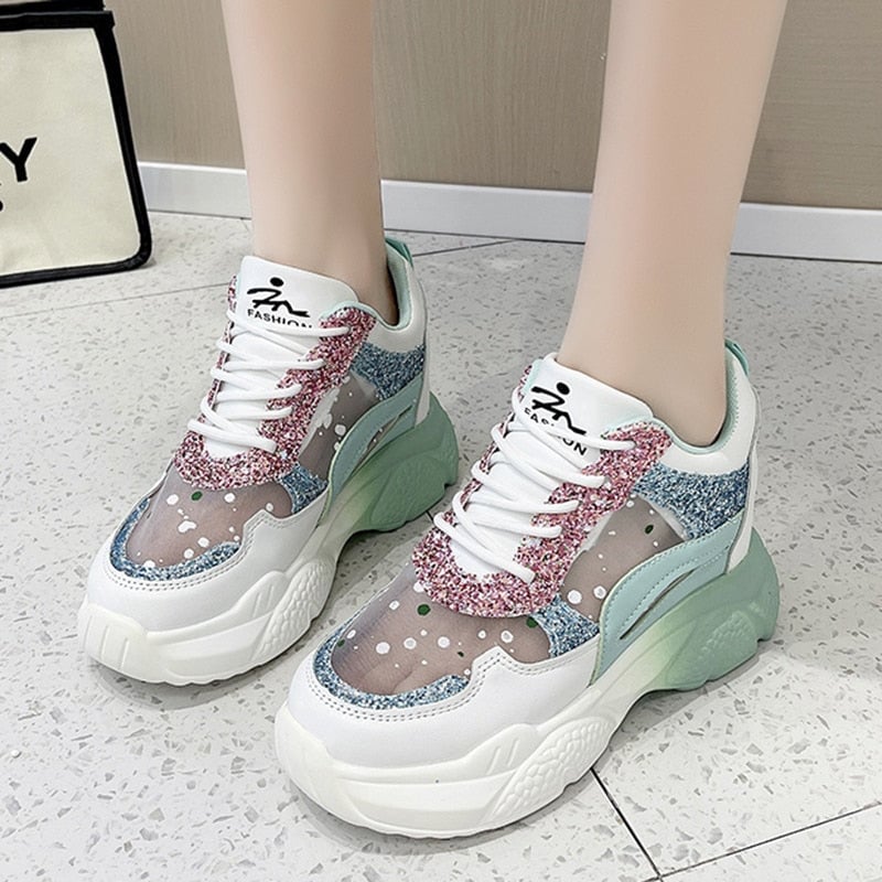 Mix Color Sequin Platform Sneakers For Women Thick Bottom Hidden Heels Casual Shoes Woman Summer Mesh Breathable Chunky Sneakers